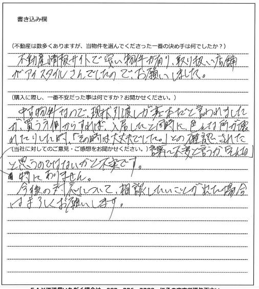 - 不動産情報サイトで安い物件が有り、取り扱い店舗がアイスタイルさんでしたのでお願いしました。
