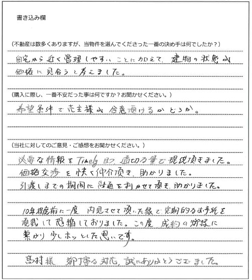 また、内覧当初からスムーズな手続き等こちらに配慮頂き、有難うございました。