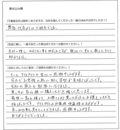 - 売却に際し、わからない事も多かったですが、親切に色々と教えて下さり、助かりました。