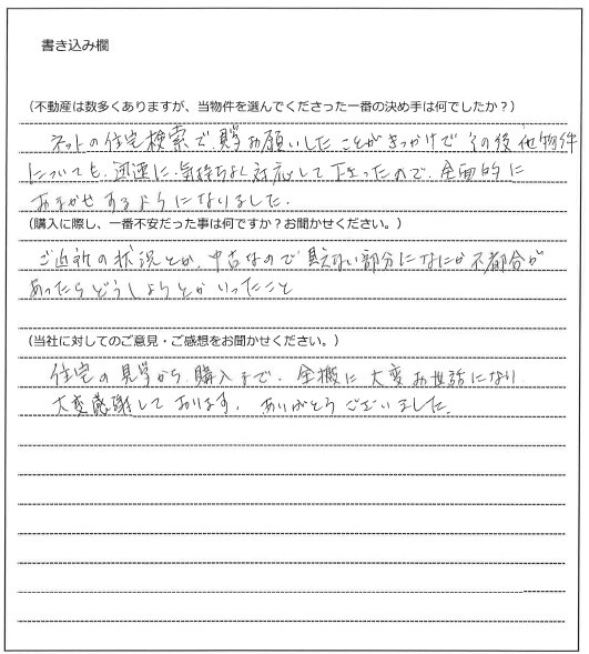 ご契約に至るまでに、たくさんの物件をご案内させていただき、途中ご迷惑をお掛けする事態もございましたが、こうして無事お引き渡しまで完了いたしましたのは、タイトなスケジュールの中ご尽力いただいたおかげでございます。その節は大変申し訳ございませんでした。