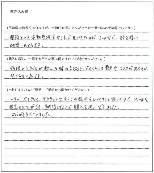 - 楽待という不動産投資サイトで見つけたのがきっかけで、話を聞いて納得したからです。